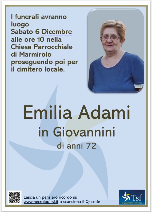È mancata all’affetto dei suoi cari EMILIA ADAMI in Giovannini di anni 72 Ne danno il triste annuncio il marito Arturo, i figli Simone con Antonietta, Mirko , Barbara, i nipoti Riccardo , Federico unitamente ai parenti tutti.