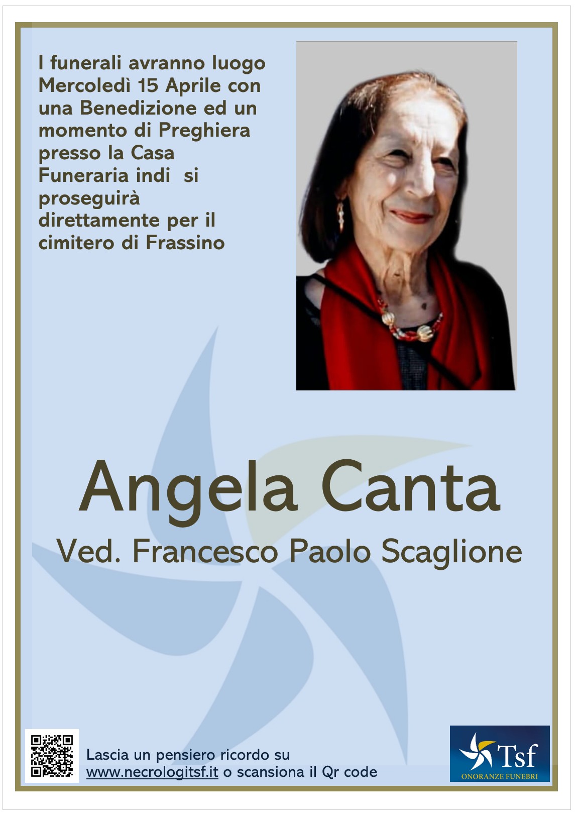 I funerali avranno luogo Mercoledì 15 Aprile alle ore 10.15 con una Benedizione ed un momento di Preghiera presso la Casa Funeraria indi si proseguirà per il cimitero di Frassino.