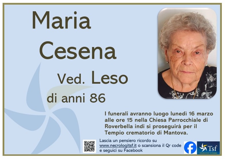 I funerali avranno luogo Lunedì 16 Marzo alle ore 15,00 nella Chiesa Parrocchiale di Roverbella indi si proseguirà per il Tempio Crematorio di Mantova