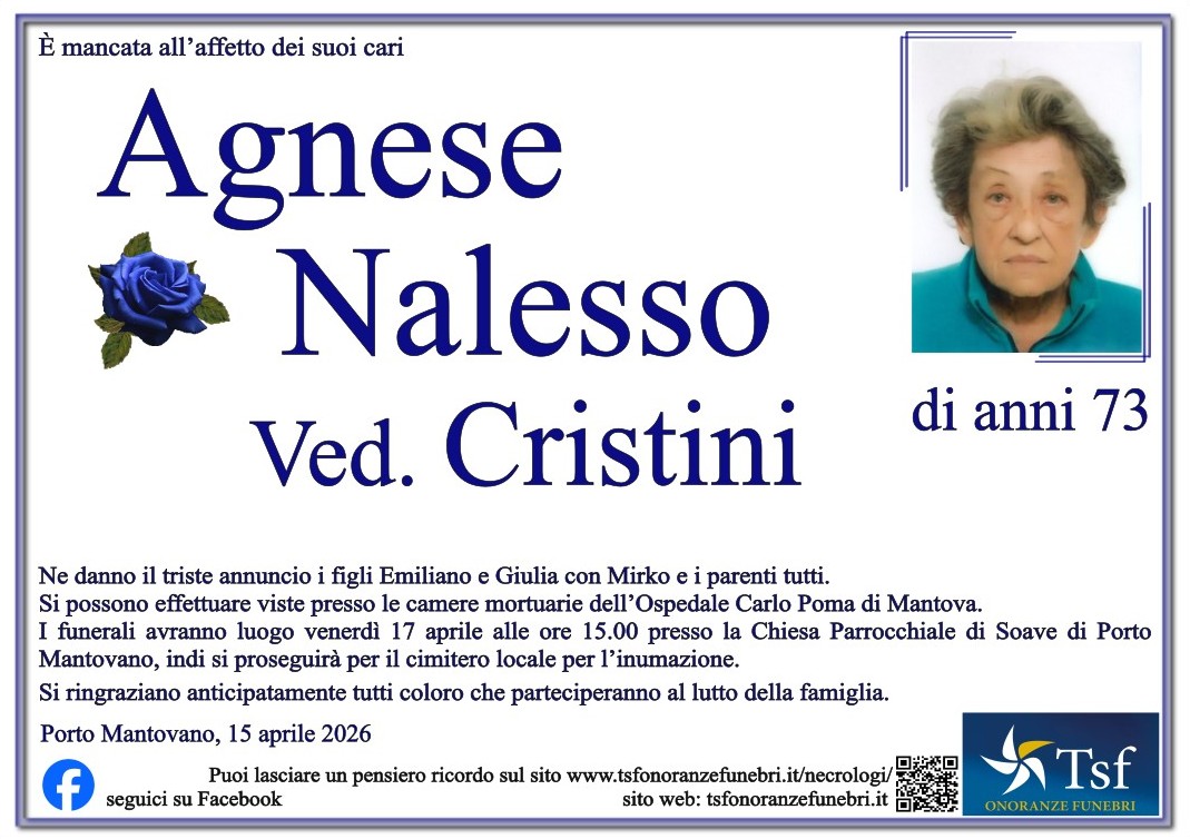 I funerali avranno luogo venerdì 17 aprile alle ore 15.00 presso la Chiesa Parrocchiale di Soave di Porto Mantovano