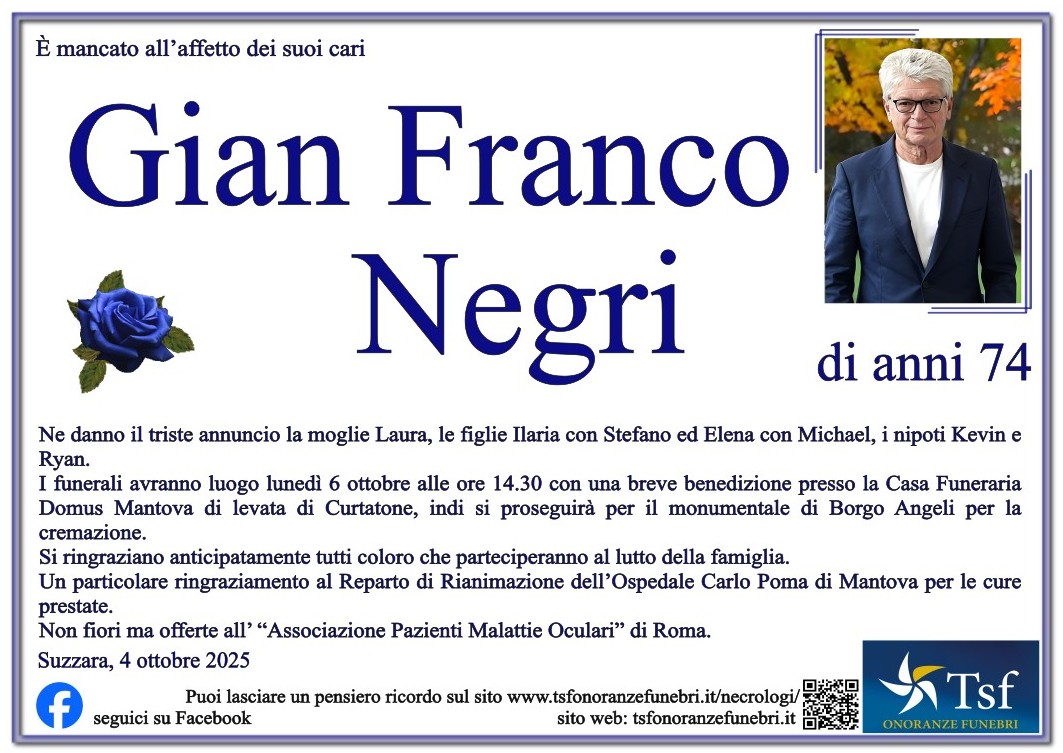 Si ringraziano anticipatamente tutti coloro che parteciperanno al lutto della famiglia. Un particolare ringraziamento al Reparto di Rianimazione dell’Ospedale Carlo Poma di Mantova per le cure prestate. Non fiori ma offerte all’ “Associazione Pazienti Malattie Oculari” di Roma