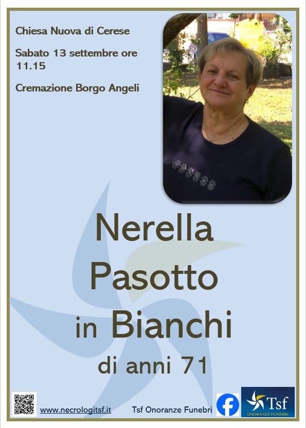 Ne danno il triste annuncio il marito Luciano, la figlia Rachele con Diego, il fratello Claudio, le care nipoti Emma ed Eva unitamente ai parenti tutti