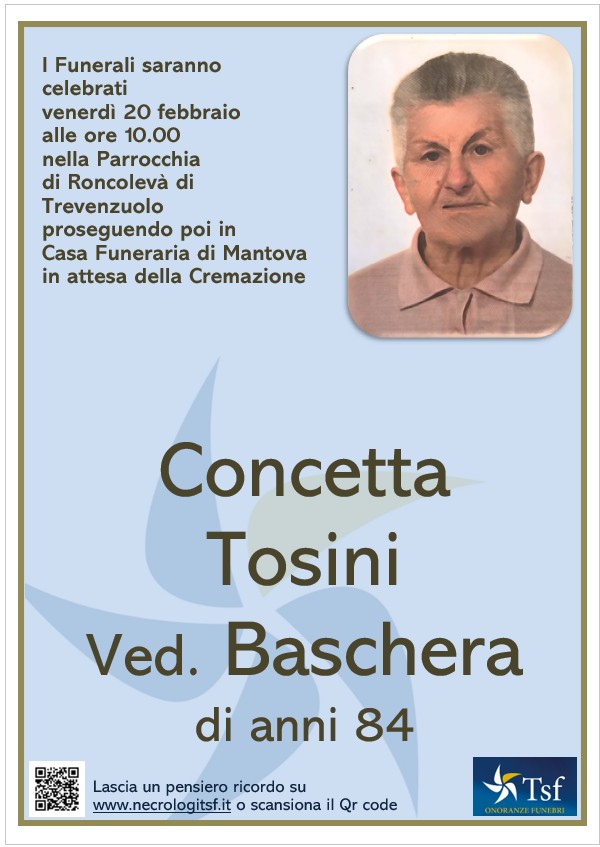 I funerali avranno luogo venerdì 20 febbraio alle ore 10 nella Parrocchia di Roncolevà di Trevenzuolo, proseguendo poi per la Domus di Mantova in attesa della cremazione.