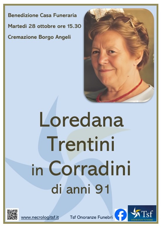 I funerali avranno luogo con una breve benedizione e un momento di preghiera martedì 28 ottobre alle ore 15.30 presso la Casa Funeraria indi si proseguirà per il cimitero di Borgo Angeli per la cremazione